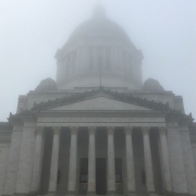 The month before, on a day Governor Ray was out of the office, a group of us climbed to the top of the dome to see Mt. St. Helen’s puffing steam. The dome stairs were closed to the public due to previous earthquake damage, but someone found the stairwell key and we were on our way. I saw some staircase bolts pulled loose from the wall on the way up the narrow spiral stairs. Even Mr. Guzzo made the climb. (Governor Ray was a stickler for protocol, and I never called him “Lou.” She also sent a staffer home who’d made the grievous mistake of wearing blue jeans to work the previous winter.) Most of us were winded by the time we got to the top.